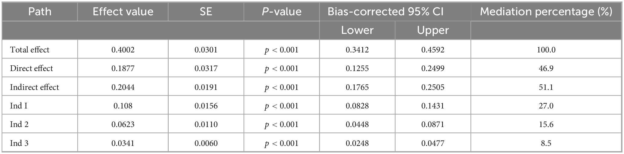 After confirming the invariance of measurements, this study examined whether there were age differences in the chained mediation model. A structural weighting model (Model 3) was developed, in which the coefficients of the structural paths were constrained to be equal across all three age groups. A comparison of model 3 with model 2 resulted in the following results: Δχ2 = 6.075, Δdf = 12, p = 0.912, ΔCFI = 0, ΔRMSEA = 0. Based on the criteria established by Cheung and Rensvold (2002), it can be concluded that structural path invariance holds, meaning that the path coefficients of the chained mediation model proposed in this study do not exhibit significant differences across different age groups. Results of the structural path invariance tests are shown in Table 7.
