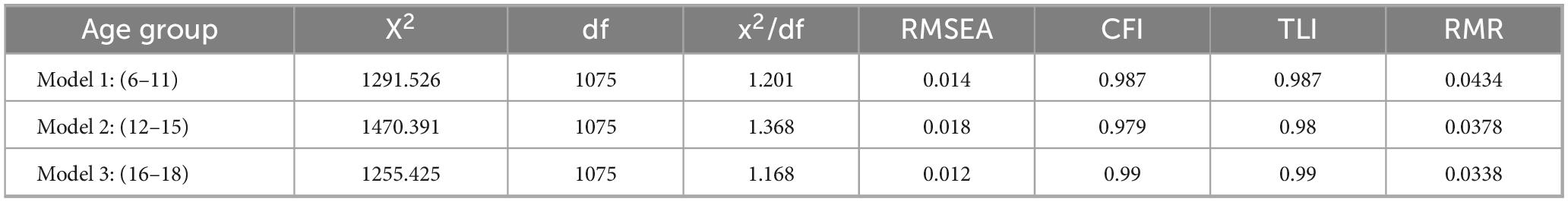 To examine the applicability of the hypothesized serial mediation model across the three age groups, a multi-group confirmatory factor analysis (MG-CFA) was conducted using AMOS 24. The sample was partitioned into three subgroups (6–11, 12–15, and 16–18 years) for this analysis. Initially, a configural invariance model (the baseline model) was specified, in which the factor structure was held constant across groups while allowing all parameters to be freely estimated. The results demonstrated that this unconstrained baseline model achieved an acceptable level of model fit across all three age groups (as presented in Table 6), with all key indices meeting the conventional thresholds for good fit. This establishment of configural invariance indicates that the fundamental structure of the model is equivalent across groups, thereby justifying subsequent, more restrictive tests of measurement and structural invariance.