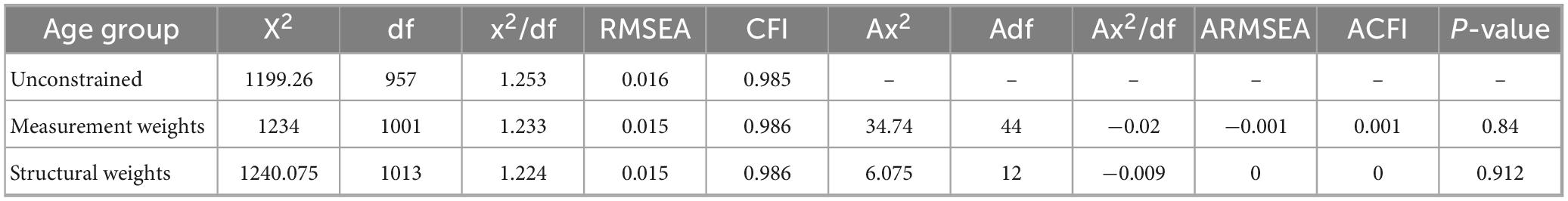 Based on the established configuration invariance of the base model (model 1), further tests were conducted to assess measurement invariance. First, the metric invariance model (model 2) was defined by limiting all factor loads to be the same for all three age groups. The results of the comparison of the two models are as follows: Δx2 = 34.74, Δdf = 44, p = 0.84, ΔCFI = −0.0002 (< 0.01), ΔRMSEA = −0.001 (< 0.015), p > 0.05. It can be concluded that the measurement of latent variables exhibits invariance across different age groups.