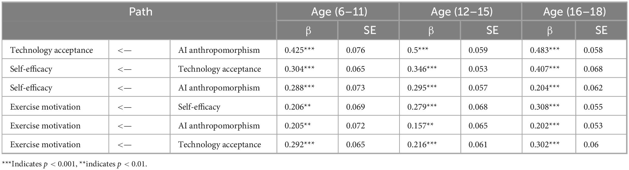 All core paths remained significant across age groups (p < 0.01 or p < 0.001), affirming broad applicability. Under confirmed overall model invariance, subtle age-related differences in significance levels were observed in specific pathways. The motivational effects of both self-efficacy and AI anthropomorphism reached their highest statistical significance in older age groups. These results indicate that intervention strategies should differentially prioritize self-efficacy and AI anthropomorphism based on the target age group’s developmental stage.