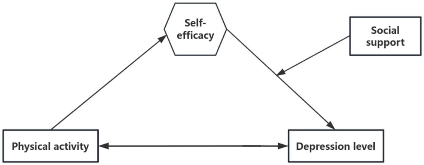 A study of 115 college students found that those with greater social support exhibited lower stress levels and better adaptation to university life (Friedlander et al., 2007). Empirical evidence suggests a significant negative correlation between social support and psychological distress, including depression and stress (Alimoradi et al., 2014; Bukhari and Afzal, 2017; Kugbey et al., 2015). Further research indicates that adolescents’ vigorous physical activity can be indirectly predicted by self-efficacy through behavioral intention, with this mediation effect being moderated by peer support levels—suggesting that peer support may partially compensate for low self-efficacy (Hamilton et al., 2017). Additionally, social support factors such as traffic safety, natural environments, and sports facilities also play a crucial role. Notably, Maleki Pirbazari et al. (2012)demonstrated that self-efficacy and peer support exert significant direct effects on depressive symptoms, while family support has an indirect influence. Among these factors, self-efficacy showed the strongest association with depression, positioning it as a key variable in depression etiology. Early self-efficacy development in students appears heavily dependent on parental and familial support, whereas students with higher self-efficacy tend to engage more actively in social relationships. Moreover, shared experiences among peers make peer support particularly beneficial in mitigating depressive symptoms. Collectively, these findings suggest that interventions aimed at enhancing self-efficacy and strengthening peer and family support may help reduce and prevent depressive symptoms in college students. Based on prior research, we propose the following hypothesis: