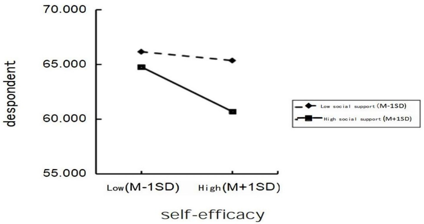 The simple effects analysis (Figure 2) revealed that as self-efficacy increased, individuals with high social support exhibited lower depression levels compared to those with low social support, indicating that social support serves as a protective factor against depression. These results further support Hypothesis 4.