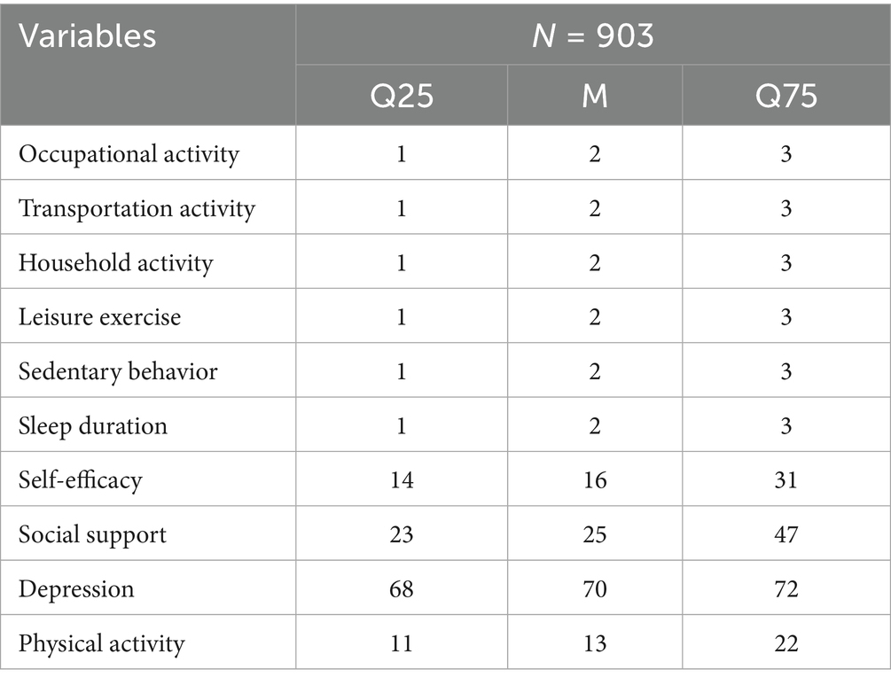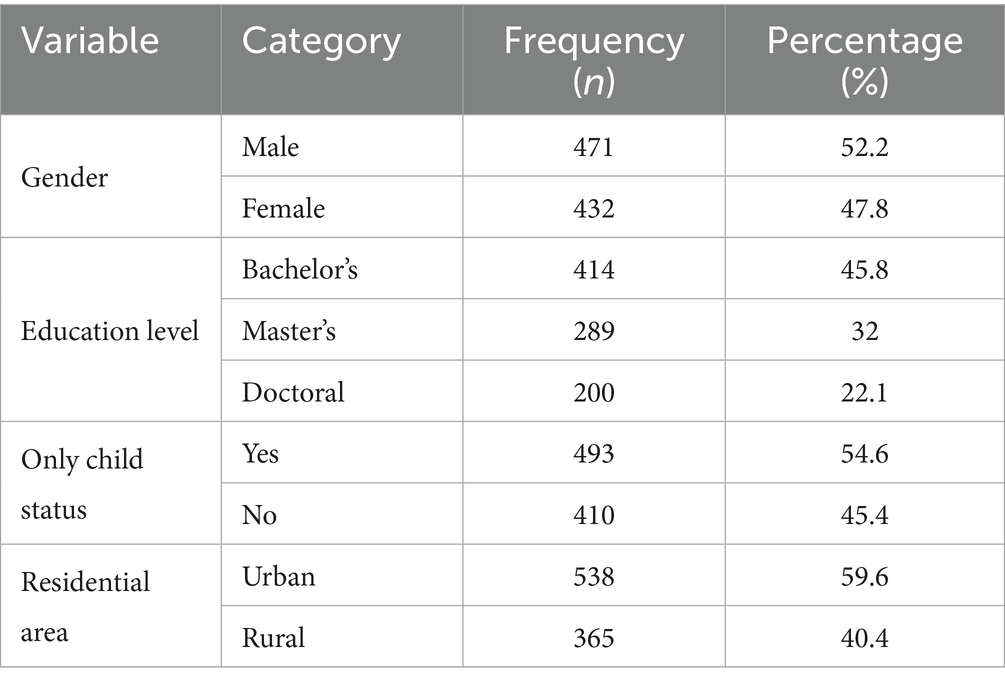 The study included 903 participants in total. The gender distribution comprised 471 males (52.2%) and 432 females (47.8%). Regarding educational attainment, the majority held bachelor’s degrees (n = 414, 45.8%), followed by master’s degrees (n = 289, 32.0%) and doctoral degrees (n = 200, 22.1%). A total of 493 participants (54.6%) were only children. In terms of residential background, 538 participants (59.6%) came from urban areas, while 365 (40.4%) were from rural regions (Tables 1, 2).