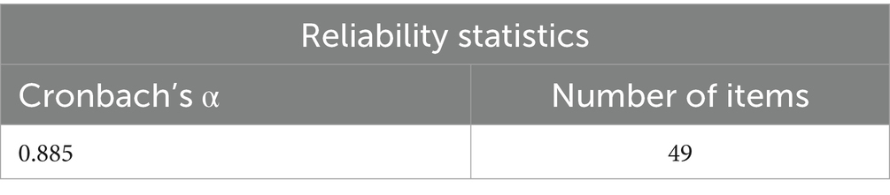 Cronbach’s alpha was employed to evaluate the internal consistency reliability of the scale, with values ranging from 0 to 1 (higher values indicating greater reliability). Statistical analysis using SPSS 26 yielded a Cronbach’s alpha coefficient of 0.885, demonstrating good internal consistency and confirming the scale’s appropriateness for subsequent analyses (Table 3).