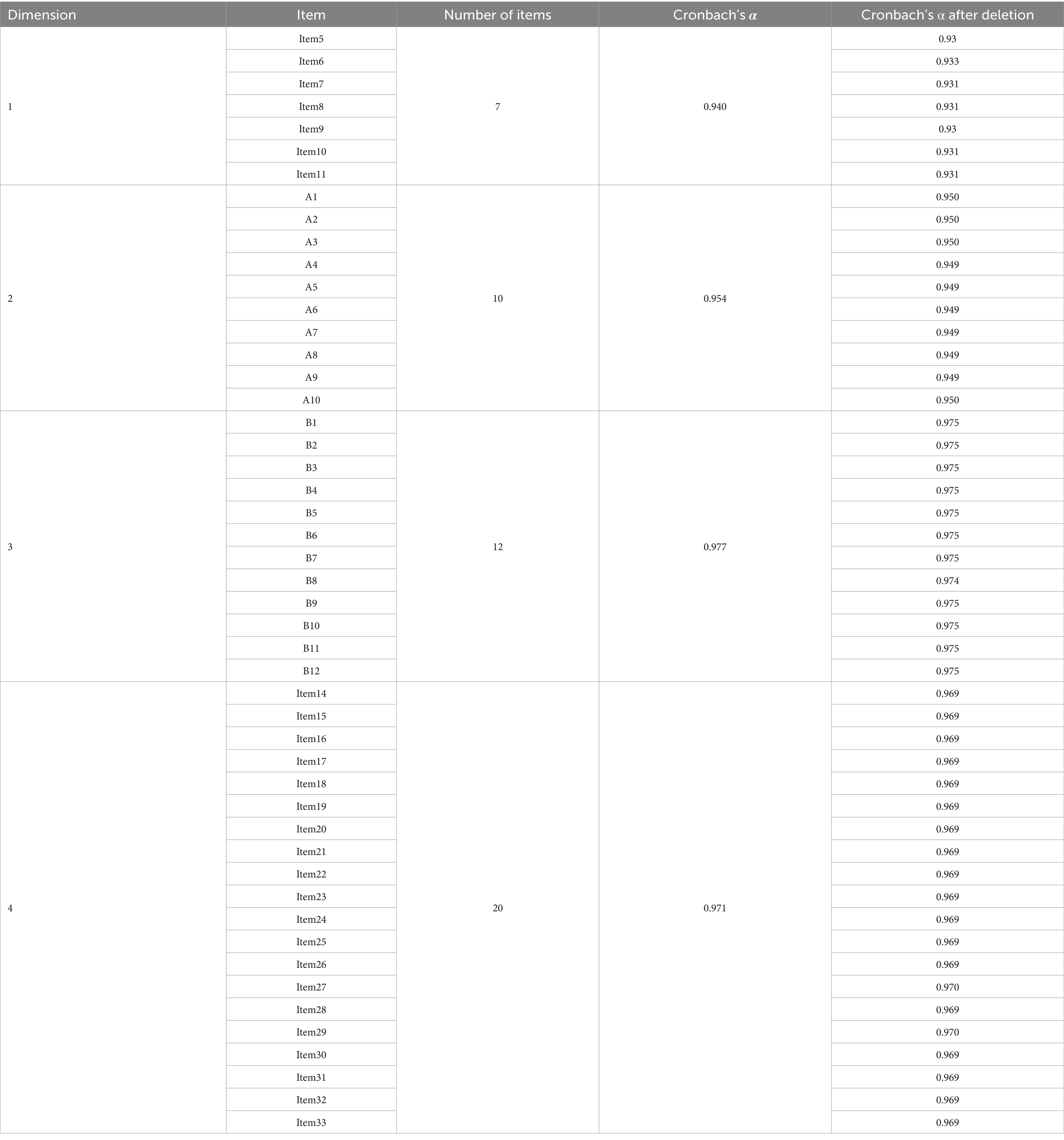 Subsequently, reliability analysis was conducted separately for the items within each of the five dimensions. Overall, all dimensions exhibited relatively high Cronbach’s α coefficients (typically around or above 0.8), indicating good internal consistency among the items within their respective dimensions (Table 4).