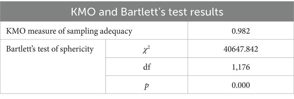 Using SPSS 26, we conducted the Kaiser-Meyer-Olkin (KMO) test and Bartlett’s test of sphericity to assess the factorability of the scale. The KMO value of 0.982 exceeded the recommended threshold of 0.8, indicating excellent sampling adequacy. Additionally, Bartlett’s test was statistically significant (p < 0.01), confirming sufficient inter-item correlations. These results demonstrate that the questionnaire meets validity requirements and is suitable for subsequent analyses (Table 5).