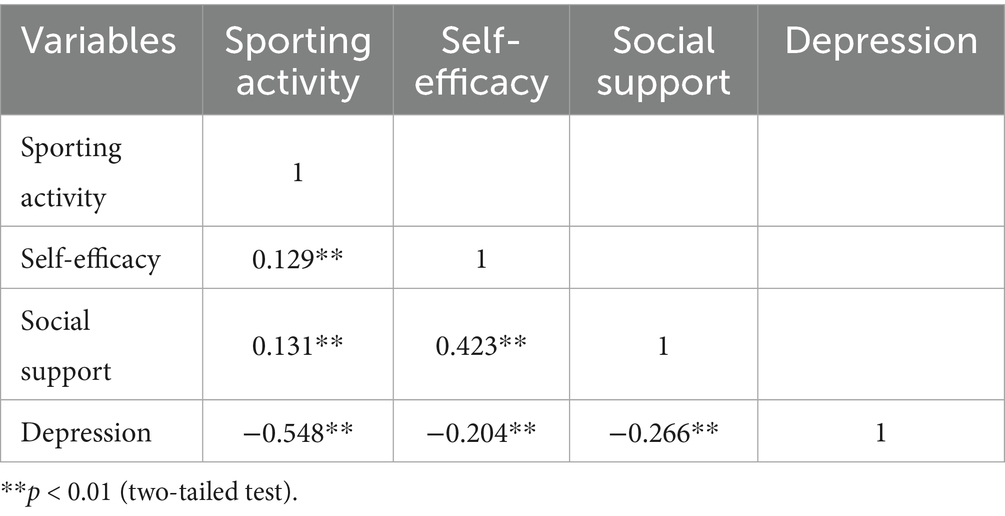 Pearson correlation analysis revealed significant positive correlations between physical activity and self-efficacy (r = 0.129, p < 0.01) as well as social support (r = 0.131, p < 0.01). A significant negative correlation was observed between physical activity and depression (r = −0.548, p < 0.01). Furthermore, self-efficacy was positively correlated with social support (r = 0.423, p < 0.01) and negatively correlated with depression (r = −0.204, p < 0.01). Social support also showed a significant negative correlation with depression (r = −0.266, p < 0.01) (Table 6).