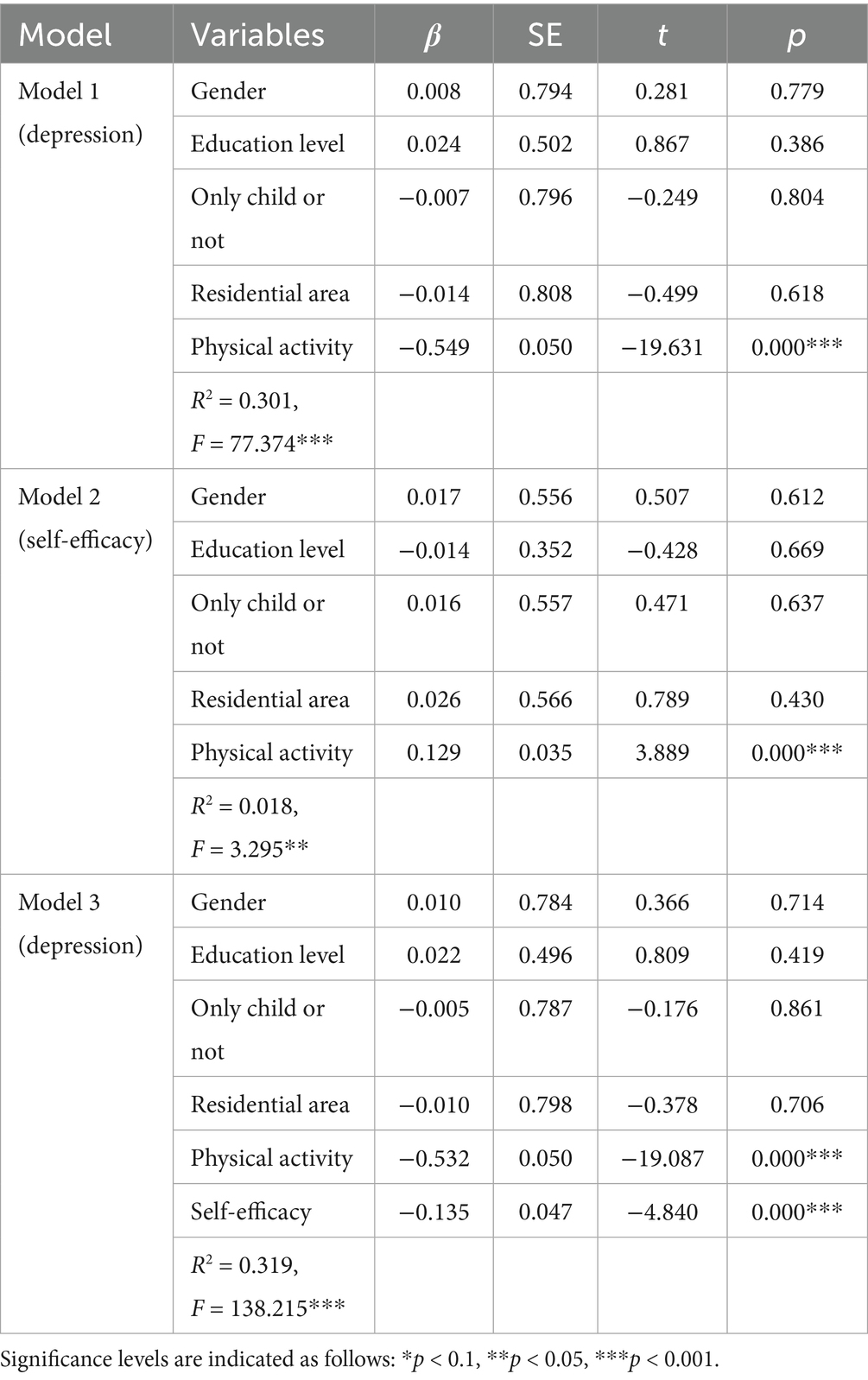 This table presents the results of three regression models examining the direct effect of physical activity on depression (Model 1), the effect of physical activity on self-efficacy (Model 2), and the combined effects of physical activity and self-efficacy on depression (Model 3).