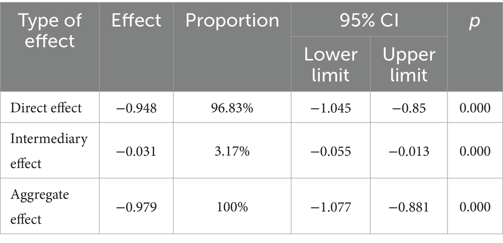 The mediation analysis revealed a significant direct effect of physical activity on depression (β = −0.948, accounting for 96.83% of the total effect). The mediation effect through self-efficacy was also significant (β = −0.031, representing 3.17% of the total effect), with a 95% bootstrap confidence interval of [−0.055, −0.031] excluding zero. These results confirm the mediating role of self-efficacy in the relationship between physical activity and depression, thereby supporting Hypothesis 3.