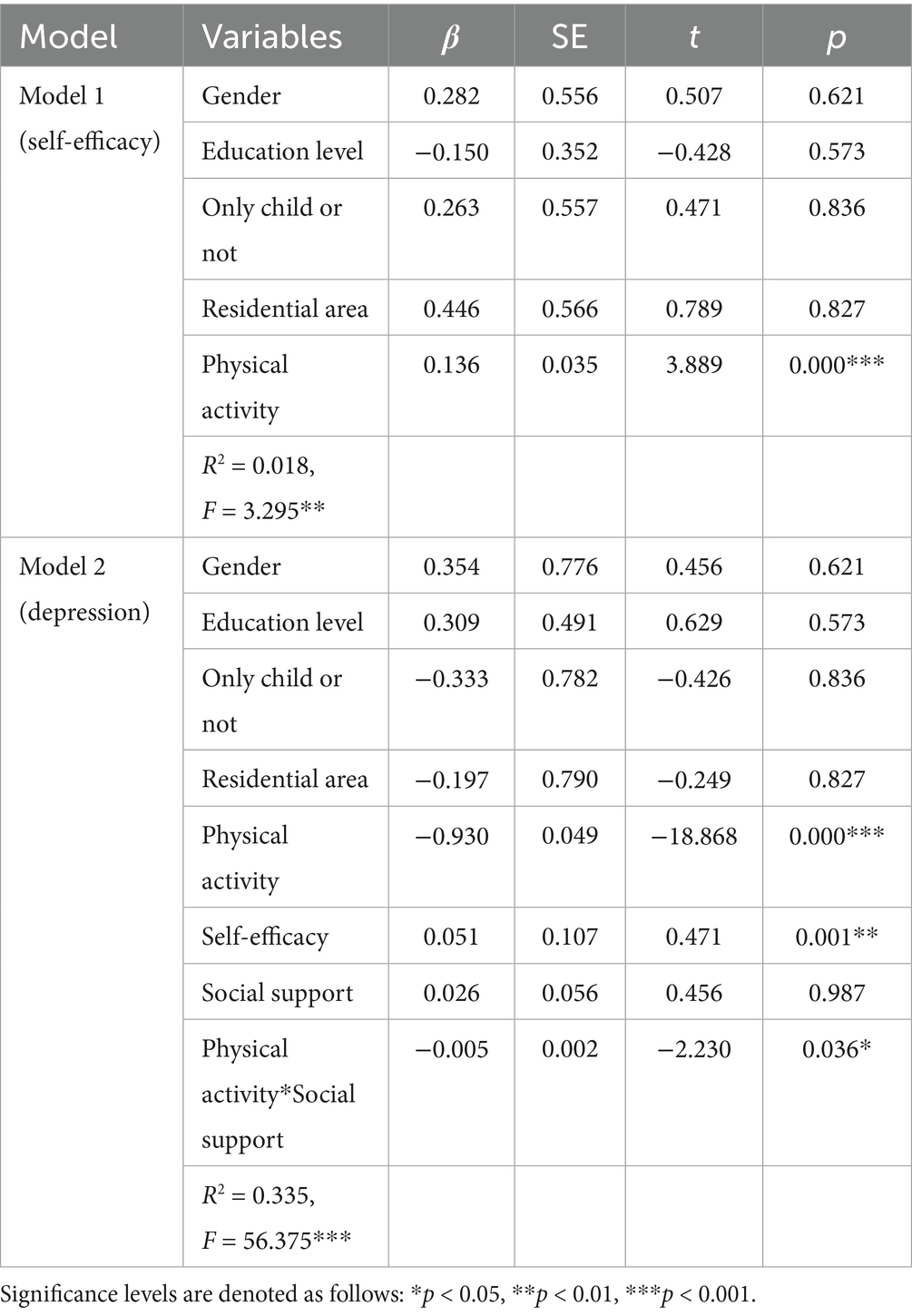 Results: Three key findings were revealed: (1) physical activity exhibited a significant negative correlation with depression levels; (2) physical activity was positively associated with self-efficacy (which in turn negatively correlated with depression), and self-efficacy partially mediated the relationship between physical activity and depression; (3) social support moderated the effect of physical activity on depression.