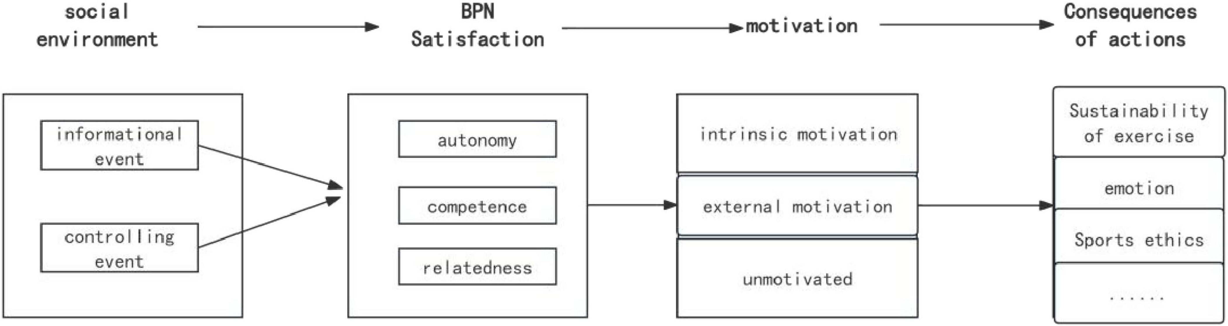 According to SDT, the extent to which basic psychological needs are satisfied plays a crucial role in shaping the type of motivation individuals develop. When adolescents’ basic psychological needs are met, they are more likely to cultivate intrinsic motivation. Specifically, these needs influence exercise motivation through three primary pathways. First, autonomy: when individuals view their physical activity as self-directed rather than coerced, they are more inclined to develop intrinsic motivation [citation (Teixeira et al., 2012)]. Second, competence: achieving skill enhancement or meeting goals in sports fulfills the need for competence, thereby promoting intrinsic motivation [citation (Vlachopoulos and Michailidou, 2006)]. Third, relatedness: physical activity often takes place in social contexts, and positive interactions with teammates satisfy the need for relatedness, making the experience pleasurable and meaningful [citation (Chen et al., 2015)]. Consequently, the satisfaction of basic psychological needs significantly impacts exercise motivation.
