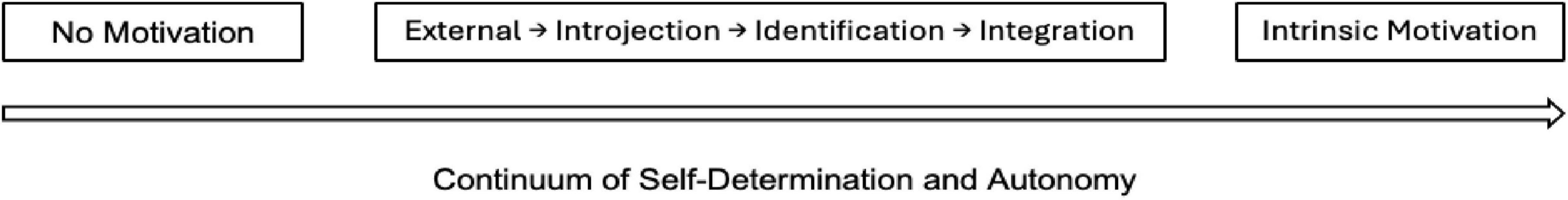 Exercise motivation is defined as the psychological impetus that drives individuals to initiate and sustain physical activity, serving as the immediate precursor to physical activity behavior (Liu et al., 2011). According to Self-Determination Theory (SDT), motivation exists along a continuum of relative autonomy, spanning from amotivation, through different types of extrinsic motivation, to intrinsic motivation (Liu et al., 2025) (see Figure 2). Different types of motivation have distinct effects on the initiation and persistence of physical activity. Individuals who are amotivated lack the intention to engage in physical activity and may view it as valueless, resulting in non-participation (Ryan and Deci, 2017). Those motivated extrinsically engage in sports to obtain rewards or avoid negative consequences; although this can sustain participation temporarily, it typically diminishes once the external incentives are withdrawn (Abós et al., 2021). Intrinsically motivated individuals engage in sports voluntarily and with a sense of autonomy. Empirical studies indicate that they demonstrate superior self-regulation and sustain higher levels of persistence, even in the face of challenges (Vasconcellos et al., 2020).