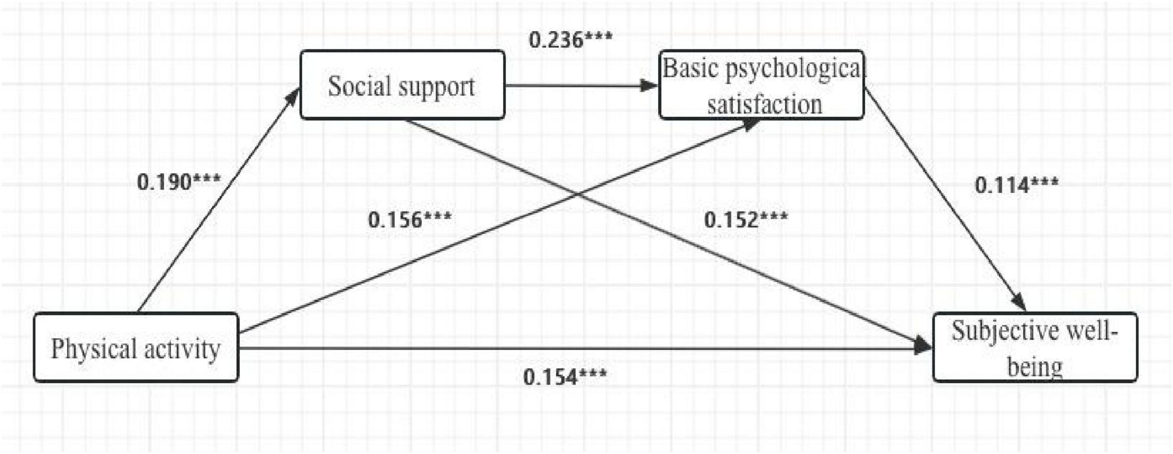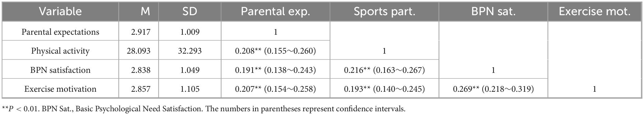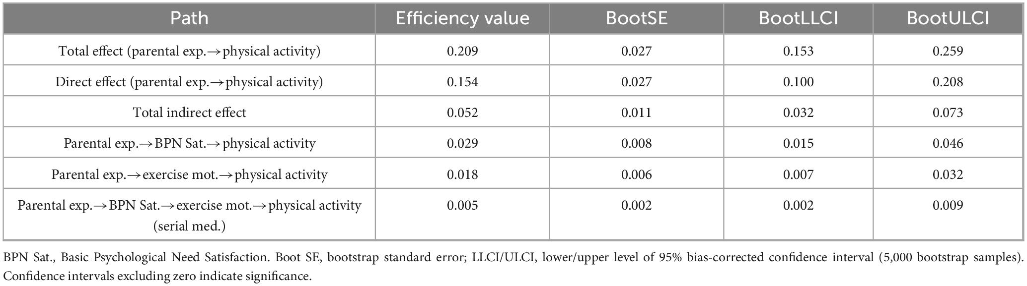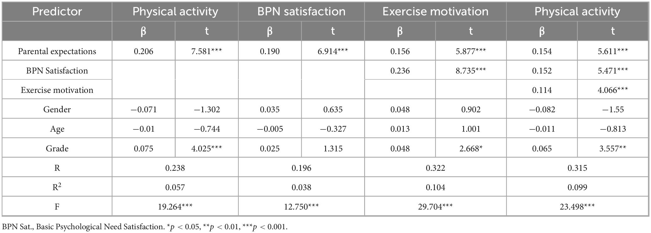 Table 2 presents descriptive statistics and bivariate correlations among the main study variables. Parental Expectations (M = 2.917, SD = 1.009), physical activity (M = 28.093, SD = 32.293), basic psychological need satisfaction (M = 2.838, SD = 1.049), and Exercise Motivation (M = 2.857, SD = 1.105) were significantly and positively intercorrelated. Parental expectations correlated positively with physical activity (r = 0.208, p < 0.01), basic need satisfaction (r = 0.191, p < 0.01), and exercise motivation (r = 0.207, p < 0.01). Basic need satisfaction correlated positively with physical activity (r = 0.216, p < 0.01) and exercise motivation (r = 0.269, p < 0.01). Exercise motivation also correlated positively with physical activity(r = 0.193, p < 0.01). These results provide preliminary support for subsequent serial mediation analysis.
