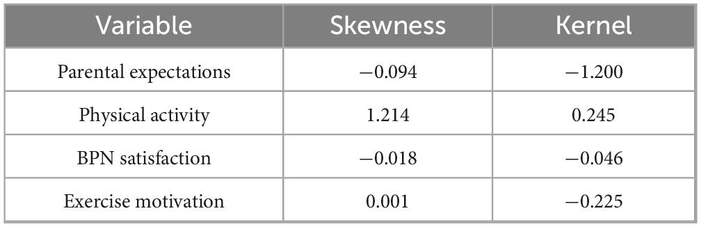 According to the normal distribution test method proposed by WEST (Kim, 2013), a variable is considered to follow a normal distribution when its skewness falls between −2 and +2 and its kurtosis falls between −7 and +7. In this study, the skewness of physical activity exceeded 1. However, with a large sample size, minor deviations in skewness or kurtosis do not significantly impact the normality test. Therefore, the variables in this study can be considered normally distributed, satisfying the prerequisite for data analysis (Table 1).