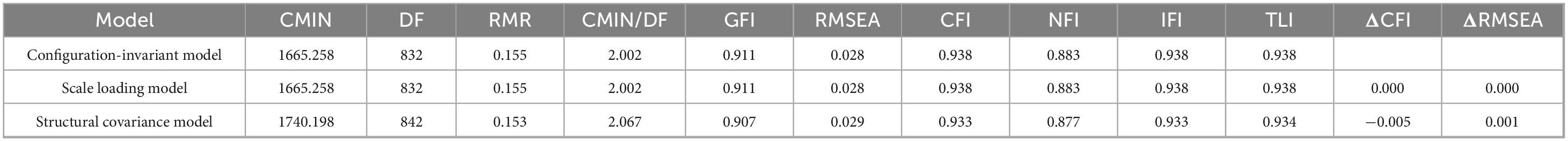 As shown in Table 3, for the chi-square test, the fit indices of the invariance model were χ2 = 1665.258, df = 832, p < 0.001, χ2/df = 2.002. The scale loading model gave results that were the same as the invariance model. The structural covariance model gave χ2 = 1740.198, df = 842, p < 0.001, χ2/df = 2.067. The chi-square value was significant, but because it is sensitive to sample size, other fit indices were checked. For absolute fit indices, RMR values were 0.155, 0.155, and 0.153. GFI values were close to 0.91 (GFI = 0.911 for the configuration-invariance and scale loading models; GFI = 0.907 for the structural covariance model), showing a good fit. For comparative fit indices, CFI and IFI were 0.938 in both the configuration-invariant and scale-loading models, and 0.933 in the structural covariance model. These values were close to the suggested cutoff of 0.95, showing excellent fit. TLI was 0.938 (configuration invariance and Metric Invariance models) and 0.934 (structural covariance model), both higher than the minimum standard of 0.90. NFI values were between 0.877 and 0.883, which was a little below the ideal standard of 0.90 but still within an acceptable range.