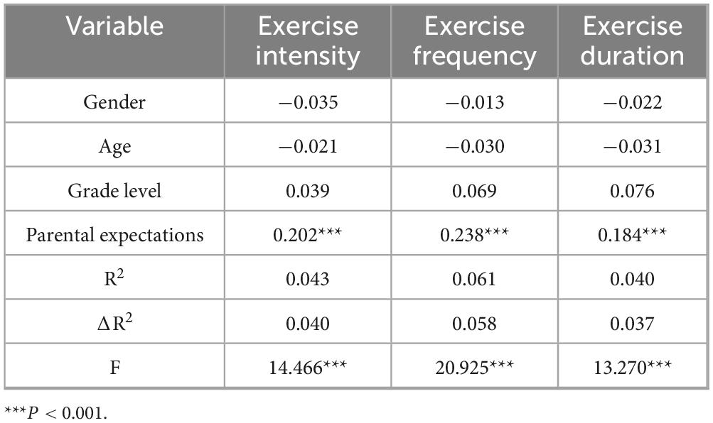 (1) When exercise intensity was the dependent variable, parental expectations exerted a significant positive influence on exercise intensity in adolescents’ physical activity (β = 0.202, P < 0.001).