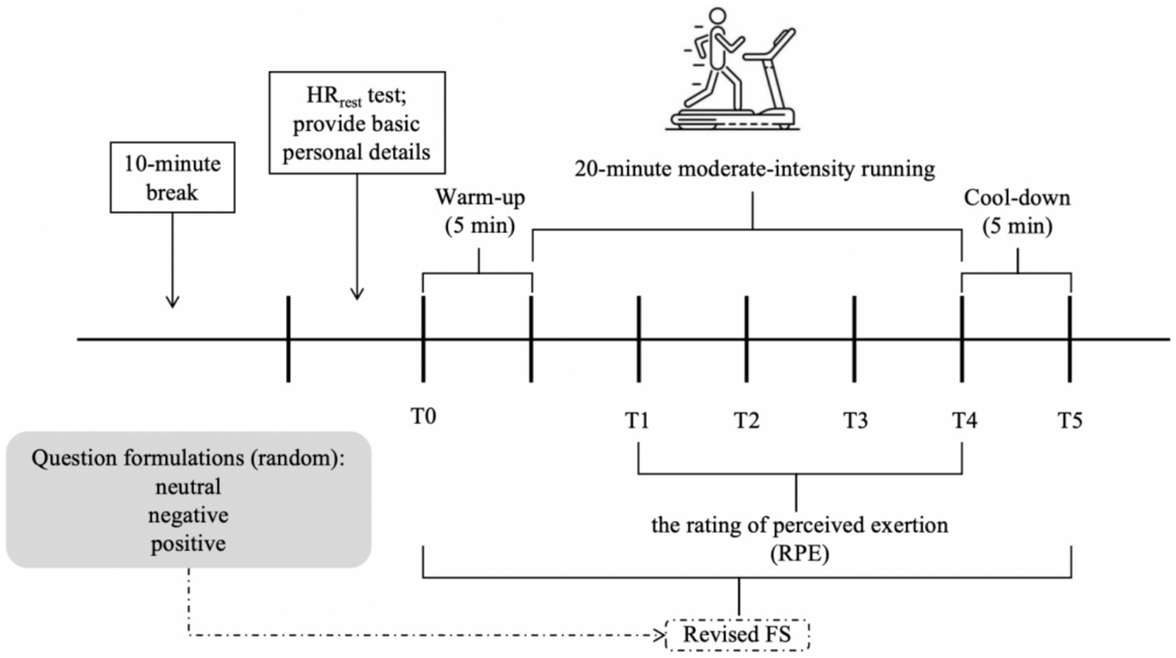 A 3 (question formulations) × 6 (measurement time) within-group experimental design was employed. The dependent variable was affective response ratings. Three types of question formulations were identified: neutral, negative, and positive. Measurement times were taken before the start of exercise (T0), at minutes 5 during exercise (T1), at minutes 10 during exercise (T2), at minutes 15 during exercise (T3), at minutes 20 during exercise (T4), and a cool-down period (5 min after exercise, T5).
