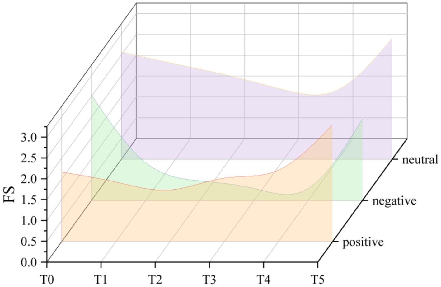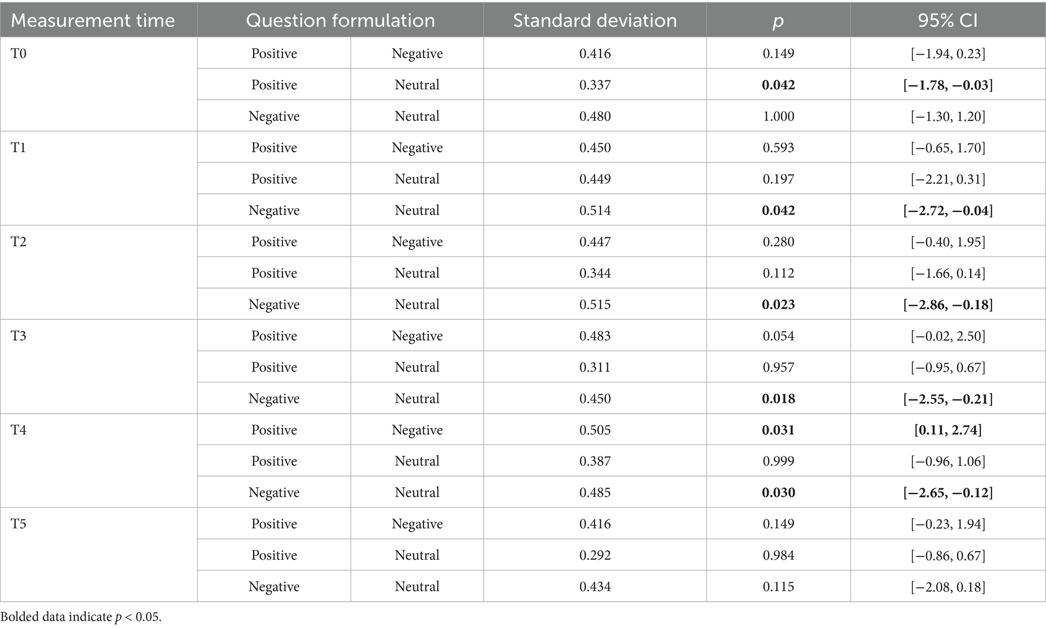 Results showed that the main effect of measurement time (F(1.726, 34.522) = 8.043, ηp2 = 0.287, p < 0.01) and question formulation (F(1.928, 38.567) = 6.382, ηp2 = 0.242, p < 0.01) were both significant, as was the interaction between the two (F(3.873, 77.461) = 3.552, ηp2 = 0.151, p < 0.05). According to simple effects analysis, affective responses were found to be better in positive question formulations compared to negative question formulations, but they did not differ substantially from neutral question formulations. Neutral question formulations elicited more positive affective responses than negative ones.