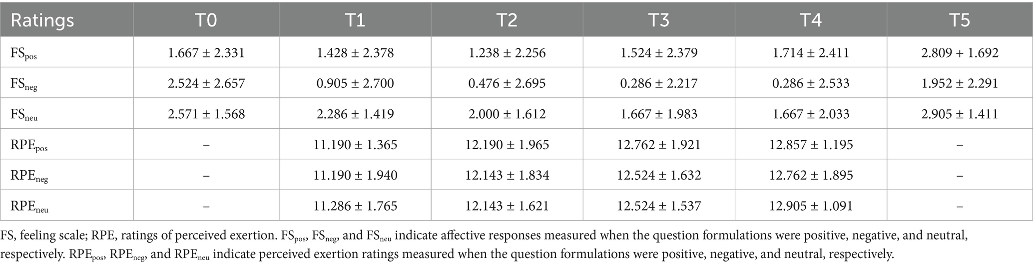Table 1 showed the descriptive statistics for the affective response ratings and RPE of the participants. Results showed that the main effect of question formulation was not significant (F(2, 19) = 0.073, ηp2 = 0.008, p > 0.05), participants’ RPE remained consistent with moderate intensity across conditions.