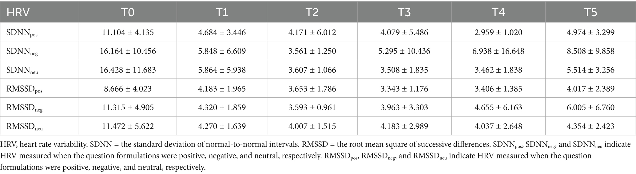 During acute exercise, there was a considerable decrease in HRV, which is in line with previous research (Rúa-Alonso et al., 2020). The outcomes also support the vagal tank theory (Laborde et al., 2018b). HRV increased throughout the warm-up, indicating that individuals’ behavioral and cognitive self-regulation have improved. As soon as the exercise began, HRV progressively dropped. This suggests that that individual experienced heightened sympathetic activation and diminished parasympathetic activity, which was further inhibited (Rajendra Acharya et al., 2006). However, the question formulation had no impact on the change in HRV. This phenomenon may be attributed to the inherent complexity of the systems and mechanisms underlying HRV, which arises from a combination of individual and environmental factors, along with their interactions (Laborde et al., 2018a). Alternatively, null findings in HRV studies may reflect the limited sensitivity of global metrics such as SDNN and RMSSD in capturing subtle cognitive-affective influences. The results further suggest that while question formulation does not affect the physiological measure of HRV, it does modulate an individual’s affective responses to psychological components.