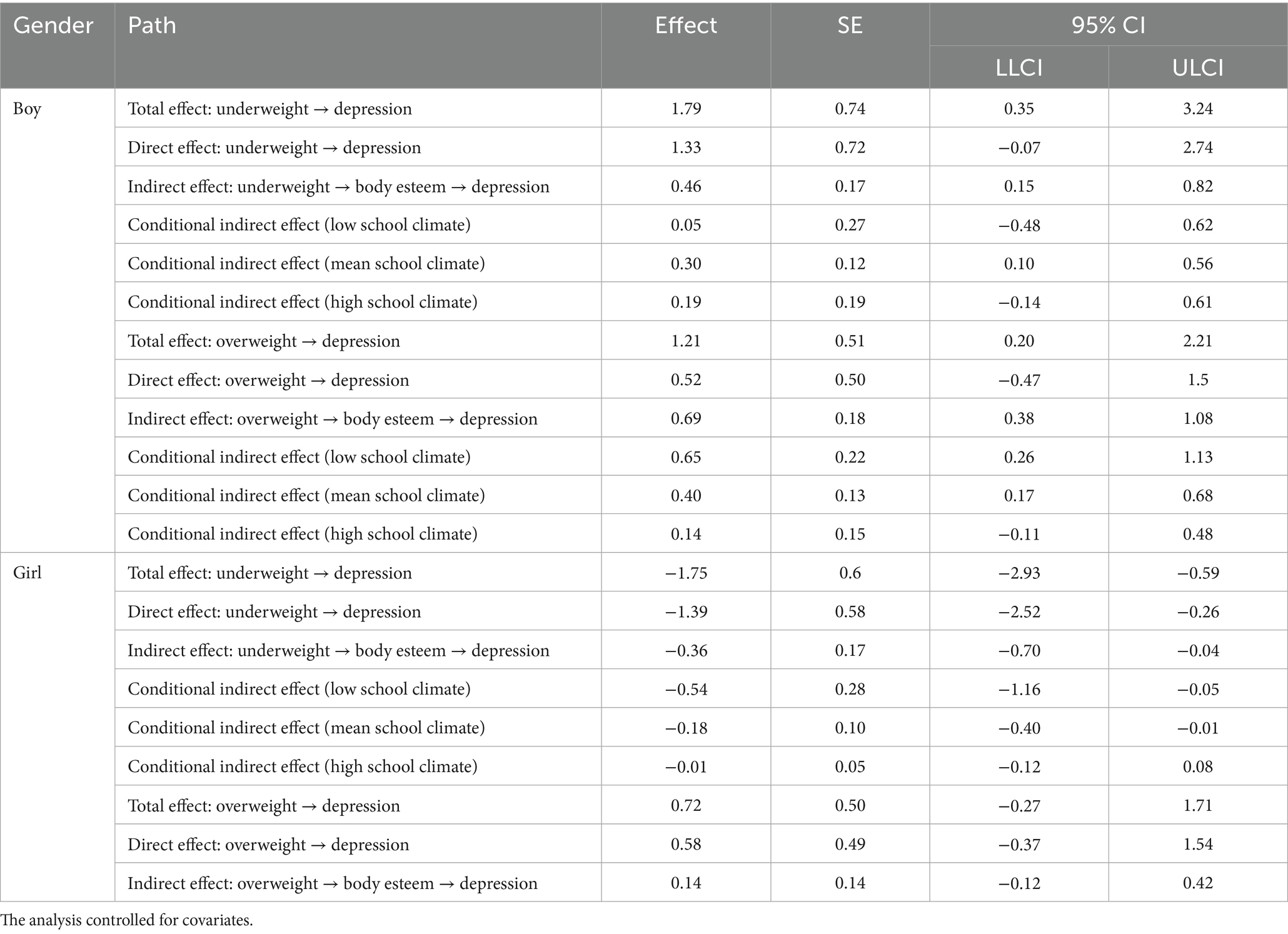 Table 4. Simple and conditional median effects of BMI on depression through body esteem at different school climate levels for boys and girls.