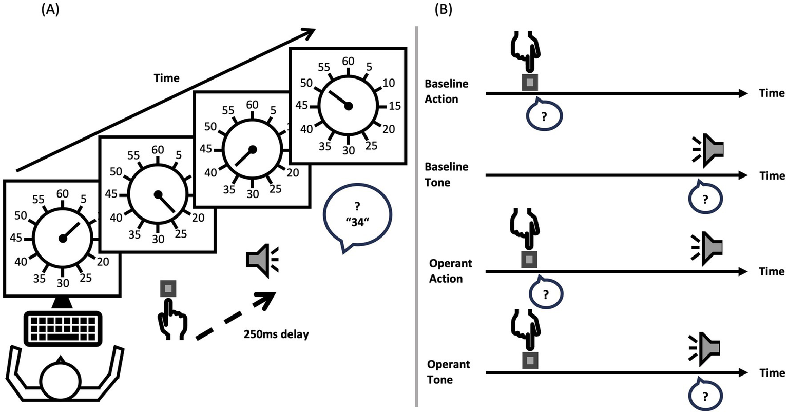 Setup temporal binding task. Depicted is the setup of the temporal binding task (A) and the four conditions (B) presented to participants in random order. The question marks in the speech bubbles indicate which event, keypress or tone, the participant should classify in terms of time perception. Watching the constantly rotating clock hand, the participant reports where the clock hand was when s/he pressed the button (baseline action or operant action) or heard the tone (baseline tone or operant tone).