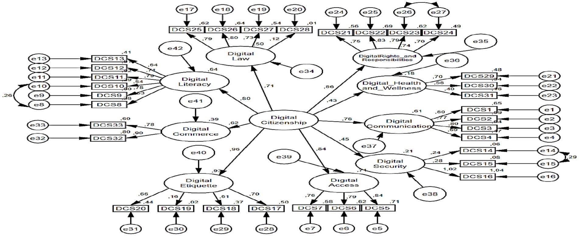 The fit index values for the second level confirmatory factor analysis for the digital citizenship scale are presented in Table 5 [X2 = 1477.99; df = 483 (p < 0.000); X2/df = 3.06; GFI = 0.77; CFI = 0.77; IFI = 0.80; SRMR = 0.09 and RMSEA = 0.08]. When the ratio of the chi-square value to the degrees of freedom is less than 5, it is indicative of a satisfactory fit between the model and the data (Byrne, 1994; Netemeyer et al., 2003). Root mean square error of approximation (RMSEA) and standardised root mean squared residual (SRMR) values below 0.10 and Goodness of Fit Index (GFI), Comparative Fit Index (CFI), and Incremental Fit Index (IFI) values above 0.90 indicate that the values of the measurement model meet the acceptable fit criteria (Brown, 2006; Kline, 2015). In the present study, the CFI, GFI, and IFI values approximated the critical value of 0.80. When the model is evaluated in its totality, the calculated goodness of fit values demonstrate that the nine-factor structure of the digital citizenship scale is confirmed. Upon examination of the correction indices, it was determined that a substantial enhancement to the model could be realised through the correlation of the errors of variables e8-e10, e26-e27, and e14-e15. In accordance with the assertion posited by Şimşek (2007) that the corrections applied to the indicator variables of a shared latent variable do not result in any issues, the requisite correction was implemented. The path diagram of the second-level Confirmatory Factor Analysis (CFA) analysis of the digital citizenship scale is presented in Figure 2.