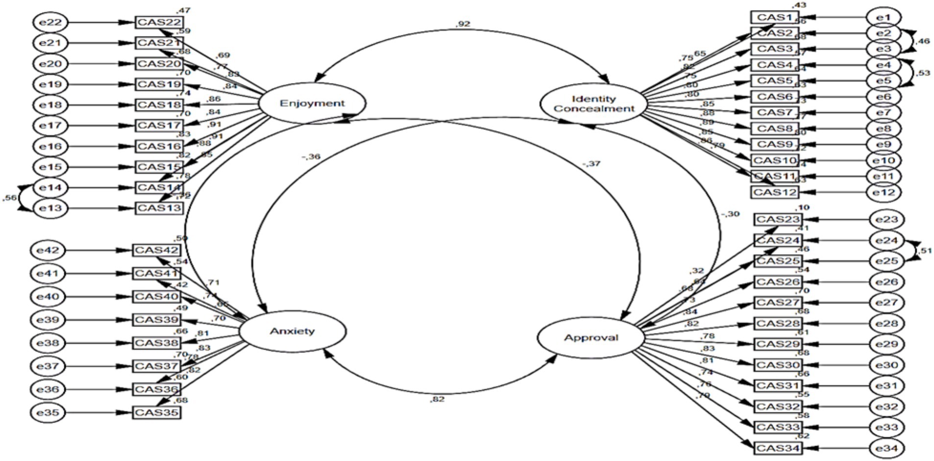 Table 8. Path analysis results for digital citizenship scale and identity concealment, enjoyment, approval, and anxiety subscales.
