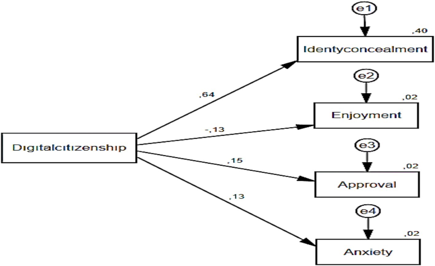 Following this stage, an examination was conducted to ascertain the presence of multicollinearity between the variables. This was undertaken by means of Pearson Product Moment Correlation analysis, which yielded values below 0.70 (Tabachnick and Fidell, 2013). The present study examined the predictive role of digital citizenship on identity concealment, enjoyment, approval, and anxiety using Path analysis. The model was based on the total score, with latent variables excluded from the analysis. In the model, digital citizenship, regarded as a single scale, was designated as an exogenous (independent) variable, while identity concealment, enjoyment, approval, and anxiety, which were examined as four distinct subscales, were designated as endogenous (dependent) variables.