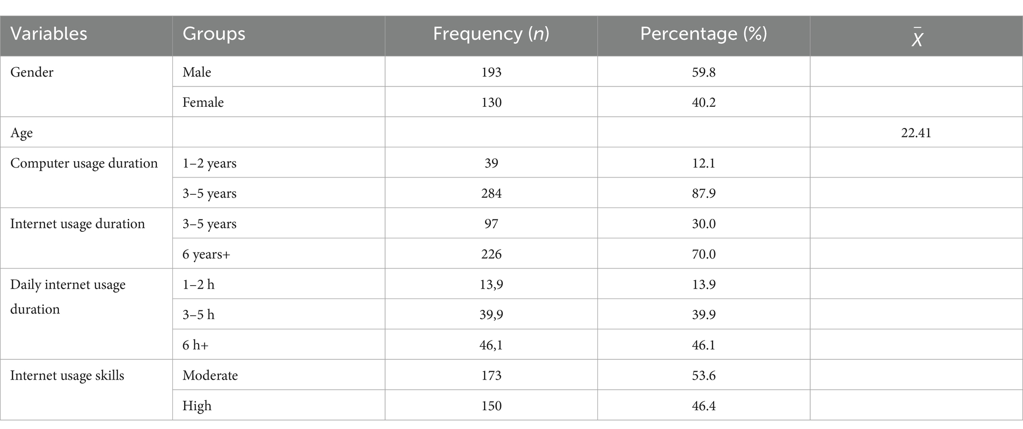 The population of this study consists of 490 prospective Physical Education and Sports teachers who are enrolled in the Physical Education and Sports Teacher Education Departments in Faculties of Sports Sciences at Ardahan University, Atatürk University and Fırat University in the 2022–2023 academic year. The sample group consists of 323 prospective Physical Education and Sports teachers, 130 females and 193 males, who studied in the Physical Education and Sports Teaching Departments determined by the convenience sampling method (Gratton and Jones, 2010). The descriptive characteristics of the sample group are presented in Table 1.