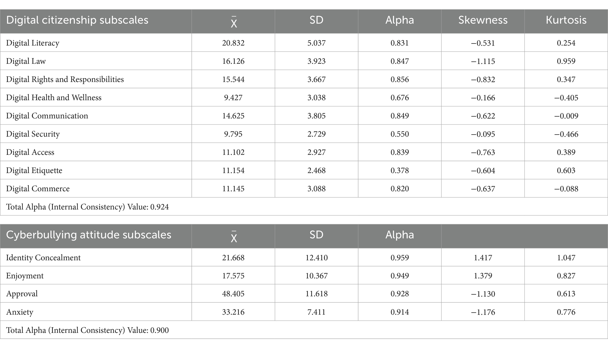 In Table 2, Cronbach’s Alpha, an internal consistency value, ranges from 0 to 1, with increasing values corresponding to enhanced consistency and reliability (Cronbach, 1990). In the present study, the total Alpha value of the Digital Citizenship Scale was found to be 0.924, and the total Alpha value of the Cyberbullying Attitude Scale was found to be 0.900. The normality assumption was tested by examining the skewness and kurtosis values, which were found to be within the range of ± 1.5 (Tabachnick and Fidell, 2013). Within this context, it was assumed that the data obtained from both scales were normally distributed.