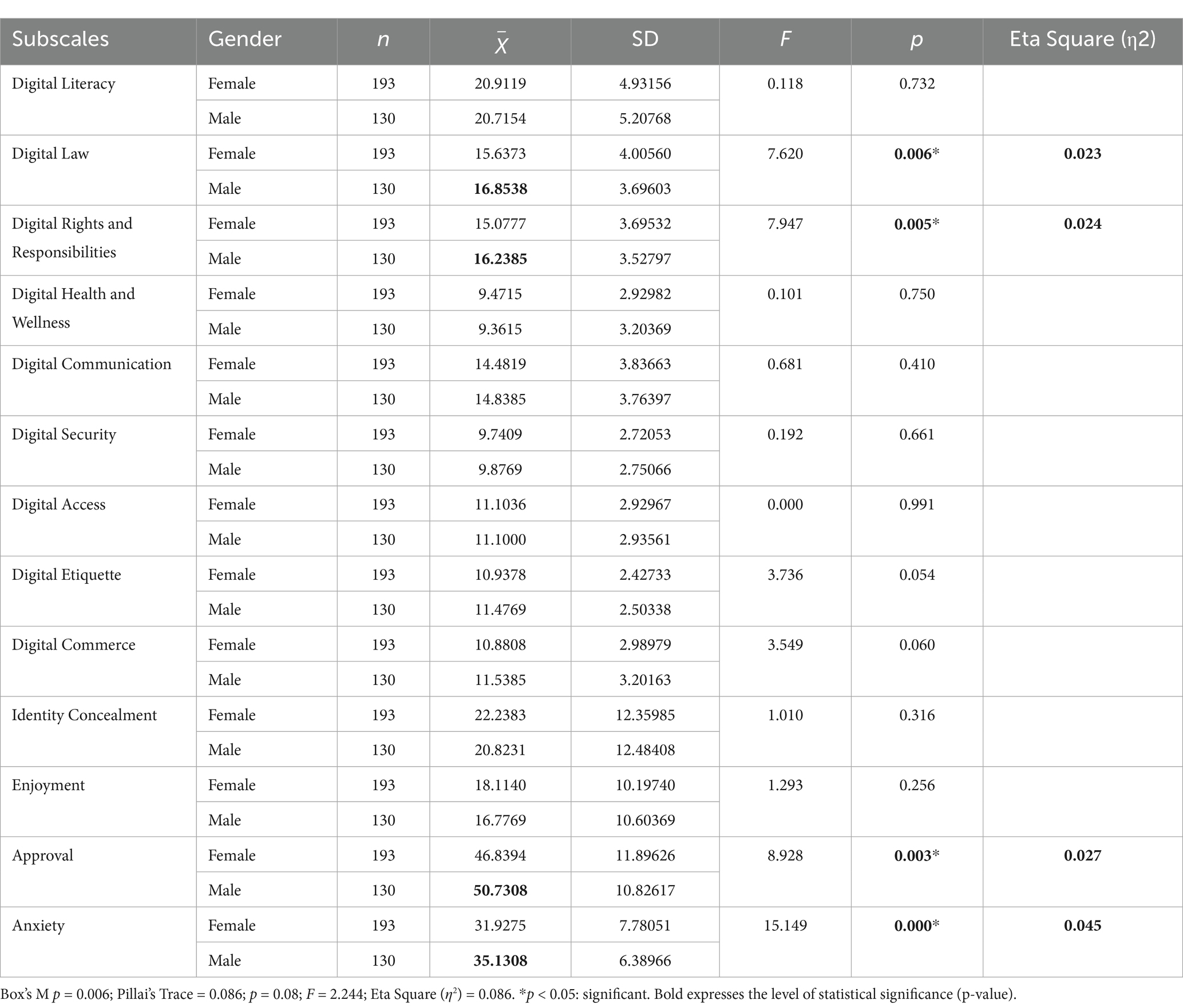 This study examined gender-based differences in students’ digital citizenship and digital experience subscales. Multivariate analysis of variance (MANOVA) results revealed no significant effect of gender on all dependent variables (Pillai’s Trace = 0.086, F = 2.244, p = 0.08). However, univariate analyses of variance (ANOVA) revealed significant differences in certain subscales. Male students scored significantly higher on the digital law and digital rights and responsibilities subscales. These findings suggest that male students may have more developed awareness in these areas. Similarly, male students also scored higher on the approval-seeking and digital anxiety subscales. The difference in digital anxiety level was particularly notable, with a significant, near-medium effect size. However, no significant gender-based differences were found on many subscales such as digital literacy, digital health and well-being, digital communication, security, and access. This suggests that basic digital skills are developed at similar levels among male and female students. The gender difference in the digital etiquette and digital commerce subscales was found to be statistically significant, with a trend favouring male students in these subscales as well. Overall, the findings suggest that gender may influence some digital behaviors and perceptions, but this influence is limited (Table 3).