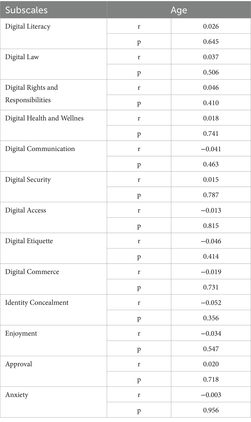Table 4. Pearson correlation test results of digital citizenship and cyberbullying attitude subscale scores according to age variable.