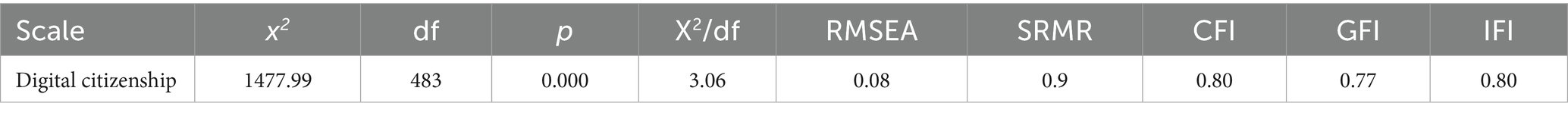 The Digital Citizenship Scale, a tool developed by İşman and Güngören (2014), was utilised as a data collection instrument in the present study. The 33-item scale is divided into nine subscales: digital communication, digital access, digital literacy, digital security, digital etiquette, digital rights and responsibilities, digital law, digital health and wellness, and digital commerce. A higher score on the digital citizenship scale indicates that digital technology and the internet are utilised more consciously. In the 5-point Likert-type scale, the responses are categorised as follows: “strongly agree” = 5, “agree” = 4, “undecided” = The scale of evaluation comprised three categories: “disagree” (2), “strongly disagree” (1), and “disagree” (3). The five negative items were reverse scored. In this study, the internal consistency of the scale was determined by the Cronbach Alpha coefficient, which yielded a value of 0.92.