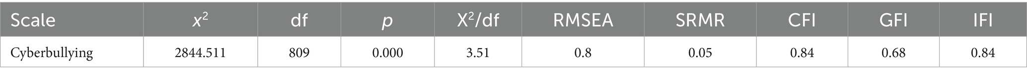 The fit index values related to the first level CFA analysis for the cyberbullying attitude scale are presented in Table 6 [X2 = 2844.511; df = 809 (p < 0.000); X2/df = 3.51; GFI = 0.68; CFI = 0.84; IFI = 0.84; SRMR = 0.05 and RMSEA = 0.08]. When the ratio of the chi-square value to the degrees of freedom is less than 5, it is indicative of an adequate fit between the model and the data (Byrne, 1994; Netemeyer et al., 2003). The values of RMSEA and SRMR falling below 0.10, and the values of GFI, CFI and IFI exceeding 0.90, are indicative of the measurement model meeting the acceptable fit criteria (Brown, 2006; Kline, 2015). The CFI, GFI, and IFI values were found to be in close proximity to the critical value of 0.80. When the model is evaluated in its totality, the calculated goodness of fit values demonstrate that the nine-factor structure of the digital citizenship scale is confirmed. An examination of the correction indices revealed that a substantial enhancement to the model could be realised through the correlation of the errors of the e13-e14, e24-e25, e2-e3, and e4-e5 variables. In accordance with the assertion posited by Şimşek (2007) that the corrections applied to the indicator variables of a shared latent variable do not result in complications, the requisite correction was implemented. As illustrated in Figure 3, the pathway diagram of the initial level of the CFA analysis of the Cyberbullying Attitude Scale is presented.