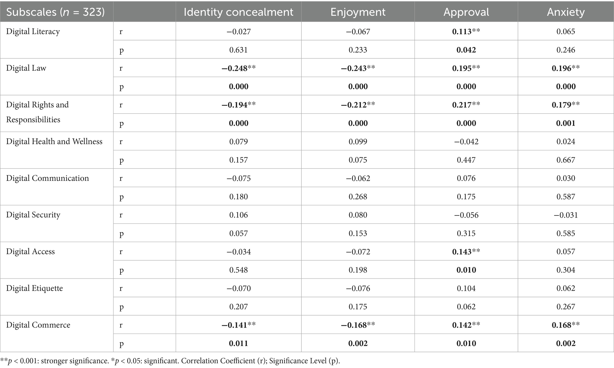 Conduct of the Pearson correlation test yielded a low-level positive significant relationship between the digital literacy and approval subscales of the digital citizenship scale and the cyberbullying attitude scale subscales. A low-level negative significant relationship was identified between the digital law subscale and the identity concealment and enjoyment subscales, and a low-level positive significant relationship was identified between the approval and anxiety subscales. A low-level negative significant relationship was identified between the digital rights and responsibilities subscale and the identity concealment and enjoyment subscales. Conversely, a low-level positive significant relationship was identified between the approval subscale and anxiety subscales. A substantial negative correlation has been demonstrated between levels of digital citizenship and the propensity for cyberbullying among university students, according to the findings of recent research. Research has indicated that higher digital citizenship, defined as the capacity to comprehend and adhere to internet etiquette, digital legislation, and responsible online conduct, is correlated with a decline in cyberbullying behaviour. Students who possess a robust comprehension of digital ethics and legality demonstrate a reduced propensity to engage in cyberbullying behaviours. Conversely, students grappling with internet addiction or exhibiting deficient digital communication skills are susceptible to an elevated risk of such behaviours. However, the present study found that digital citizenship was only significantly correlated with perpetrating cyberbullying, rather than being a victim of it (Zhong et al., 2021; Dunaway and Macharia, 2021). Hassan et al. (2023) stated that there is a significant correlation between cyberbullying and social media addiction among law students. The researchers concluded that, while anonymity facilitates these behaviours, gender and academic level differences do not have an effect. Martínez-Monteagudo et al. (2020) demonstrate a substantial correlation between cyberbullying and suicidal ideation, as well as elevated anxiety, depression and stress levels. This underscores the necessity for efficacious interventions within university settings. Karakuş and Turan’s (2022) study, titled “Examining the Relationship between Adults’ Cyber Bullying Behaviours and Digital Citizenship Skills,” and Kaptangil and Çalışır’s (2023) study, titled “Moderating Effect of Alexitimia on the Relationship between Digital Citizenship and Cyber Bullying,” both found low-level negative significant relationships. Consequently, the present study corroborates the findings of preceding research in the relevant literature.