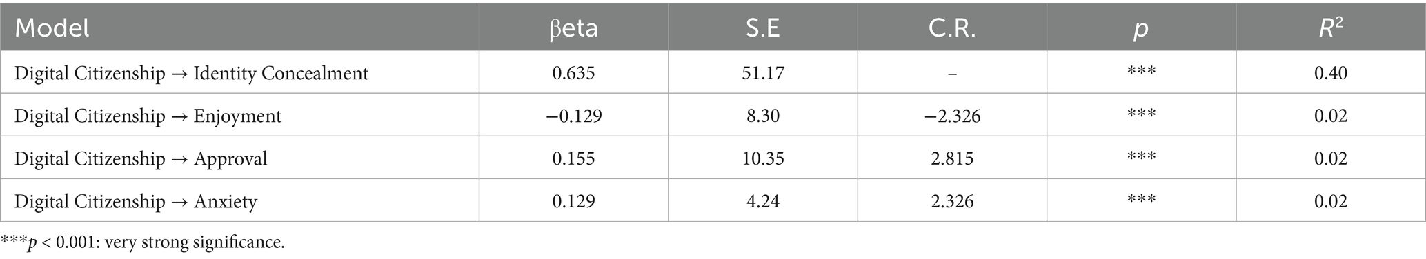 A thorough examination of the values associated with the model presented in Table 8 revealed that digital citizenship exhibited a substantial predictive capacity for identity concealment, accounting for 40% of the observed variance (β = 0.635; R2 = 0.40; p < 0.05). The findings of the study indicated that digital citizenship exhibited a substantial predictive capacity for arbitrariness, accounting for 2% of the observed variance (β = −0.129; R2 = 0.02; p < 0.05). The findings of the study indicated that digital citizenship exhibited a substantial predictive capacity for approval, accounting for 2% of the observed variance (β = 0.155; R2 = 0.02; p < 0.05). Furthermore, the findings of the study indicated that digital citizenship exhibited a substantial predictive capacity for anxiety levels, accounting for 2% of the observed variance (β = 0.129; R2 = 0.02; p < 0.05) (Figure 5).