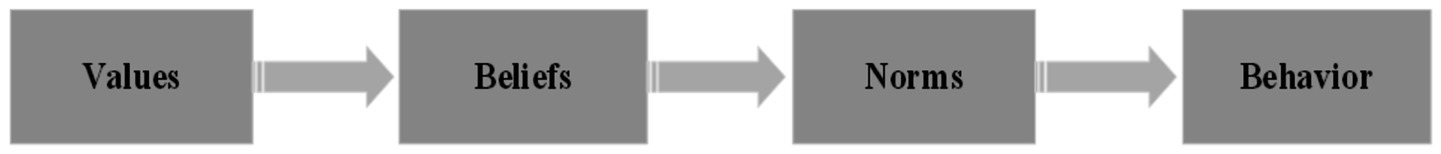 Flowchart with four gray boxes connected by arrows. The boxes are labeled: Values, Beliefs, Norms, and Behavior, indicating a sequential relationship from values to behavior.