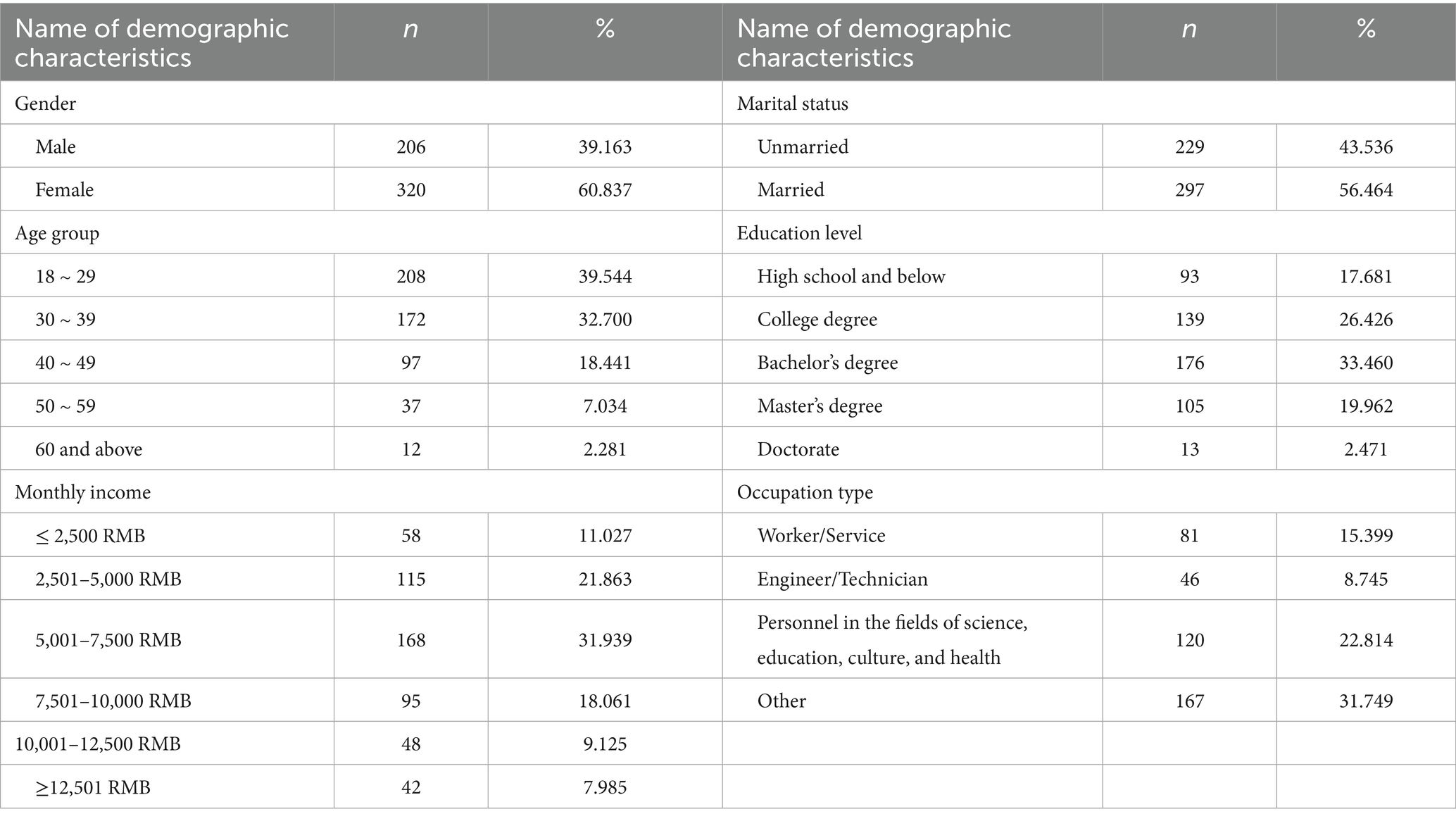 As shown in Table 1, the highest number of respondents by gender is women, with 320 respondents, accounting for 60.8%, which is higher than the number of male respondents. This can be attributed to the fact that the survey was distributed to supermarket members, and women are more likely to register for supermarket membership than men. Regarding age, the largest proportion of respondents is from the 18–29 age group, accounting for 39.5%. Individuals under 18 were excluded due to the lack of disposable income. In terms of education, the highest frequency is at the university undergraduate level (33.4%), while the lowest proportion is at the doctoral level (2.4%). As for marital status, the highest frequency is married, with 297 respondents, accounting for 56.4%. Regarding occupation, “other” is the highest category with 167 respondents, accounting for 31.7%. The range of income with most number of respondents is 5,001–7,500 RMB, comprising 31.94%. These findings suggest that the data collected from the survey are reasonable and suitable for further analysis (Table 2).