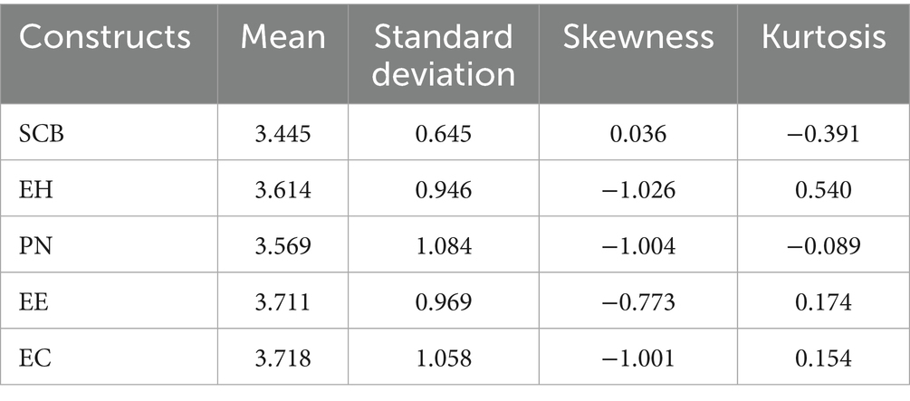 The mean value of Sustainable Consumption Behavior (SCB) was 3.445, slightly above the scale midpoint, indicating that respondents generally exhibited a moderately positive tendency toward sustainable consumption. The mean score of Enhancing Interpersonal Harmony (EIH) stood at 3.614, reflecting that respondents attached considerable importance to interpersonal harmony in the given context. Personal Norm (PN) yielded a mean of 3.569, suggesting that respondents’ moral responsibility toward sustainable consumption was at a moderate level. Ethics Evaluation (EE) recorded the highest mean value among all variables at 3.711, demonstrating that respondents generally recognized the ethical correctness of sustainable consumption. Environmental Cognition (EC) presented a mean of 3.718, which was close to that of EE, indicating that respondents had a relatively high self-perceived level of attention to and understanding of environmental issues. Regarding standard deviation (SD) results: All variables exhibited SD values ranging from [0.645 to 1.084], indicating a certain degree of heterogeneity in scale responses. Particularly, Personal Norm (PN) showed the highest degree of dispersion (SD = 1.084), suggesting significant differences in moral responsibility perception among different respondents. Analysis of skewness and kurtosis results revealed that except for SCB (skewness = 0.036), all other variables demonstrated negative skewness values [−0.773 to −1.026], indicating slight left skewness of the data (responses clustered at the “agree” end). Kurtosis values all fell within the range of ±0.5, meeting the robustness requirements for data distribution in PLS–SEM analysis.