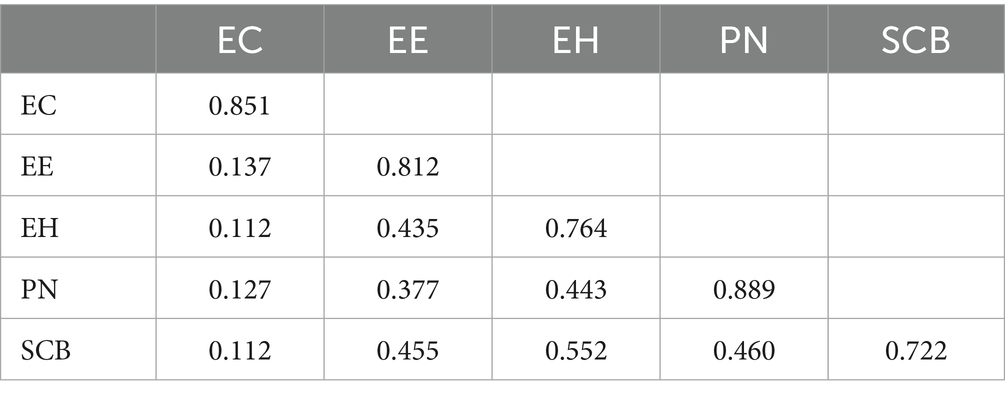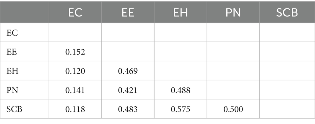In this study, Smart PLS were used in the statistical analysis of the questionnaire survey data. Cronbach’s alpha coefficients were used to test the internal consistency of the scales and ensure their reliability (Cronbach and Meehl, 1955). Composite reliability (CR), average variance extracted (AVE), the square root of AVE, and Pearson correlation coefficients among latent variables were used to conduct the validity tests. HTMT ratios examine potential multi-collinearity (Kautish et al., 2022). PLS–SEM is chosen for its ability to address measurement errors in the structural model while estimating causal relationships between latent constructs a two-step analysis is conducted to test these hypotheses (Table 3).