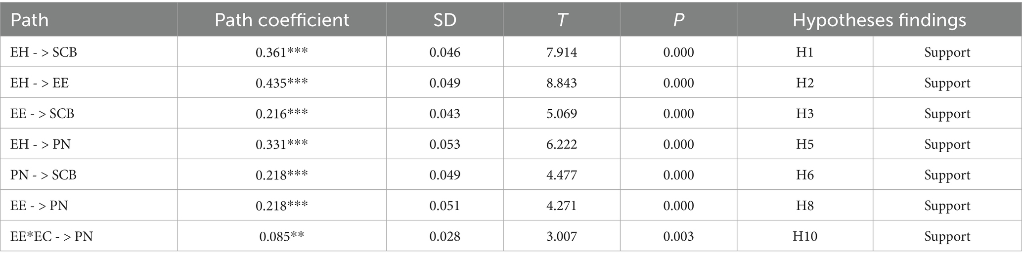 The relationship between values and personal norms has been confirmed by most scholars (Nordlund and Garvill, 2003). Hou et al. (2014) studied the new generation of employees with good interpersonal harmony and found that this harmonious work value helps them maintain a positive self-view. When employees work in ways that align with their positive self-view, a sense of self-confidence will be created, which can lead to interpersonal altruism in the workplace and further promote pro-social behaviors of employees. Chen et al. (2022) indicated that interpersonal harmony represents an optimistic, open attitude that helps stabilize interpersonal relationships and plays a critical role in resolving workplace interpersonal conflicts (Chen and Li, 2009; Zhang et al., 2004). Therefore, individuals with higher interpersonal harmony tend to engage in behaviors that align with their positive self-views, leading to altruism, in turn positively influencing personal norms (Guan and Zhang, 2023) Interpersonal harmony enhances interpersonal relationships and communication, and good communication has a significant impact on personal norms (Han and Xu, 2020); Dunlop et al. (2008) also found that interpersonal communication regarding health issues influences people’s perceptions of health risks and corresponding behaviors. If these effects are strong enough, interpersonal communication can influence final behavior by altering individuals’ normative judgments (Kahlor, 2007). Individuals who place greater emphasis on interpersonal information are more likely to enhance their personal norms (Wang et al., 2023).