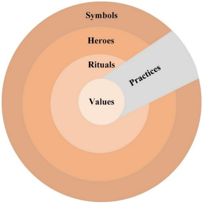As shown in Figure 1, culture encompasses symbols (words, gestures, and images with specific meanings), heroes (living or deceased, real or fictional figures), and rituals (collective activities). In the “Onion Diagram,” the outer layer of culture can change rapidly, but the core part representing culture (i.e., values) changes very slowly (Hofstede, 1980). Confucian culture has been identified as one of the 10 cultural clusters in global research (Gupta et al., 2002). Confucian cultural is the most important part of China’s overall worldview (Hofstede, 1980; Lau et al., 2021); it is not merely a relic of the past but also shapes Chinese values and exerts a profound influence on Chinese people’s lifestyles and consumption patterns (Xu et al., 2022; Terpstra-Tong and Ralston, 2025). As illustrated in the aforementioned onion model (Hofstede, 1980), this study posits that Confucian culture exhibits a multidimensional structure. Interpersonal harmony as Confucian culture core value (Chen et al., 2015), and serves as one of the moral standards in Confucian culture (Han and Altman, 2010). This study thus focuses exclusively on interpersonal harmony values on Chinese people’s behavior from a Confucian cultural perspective.