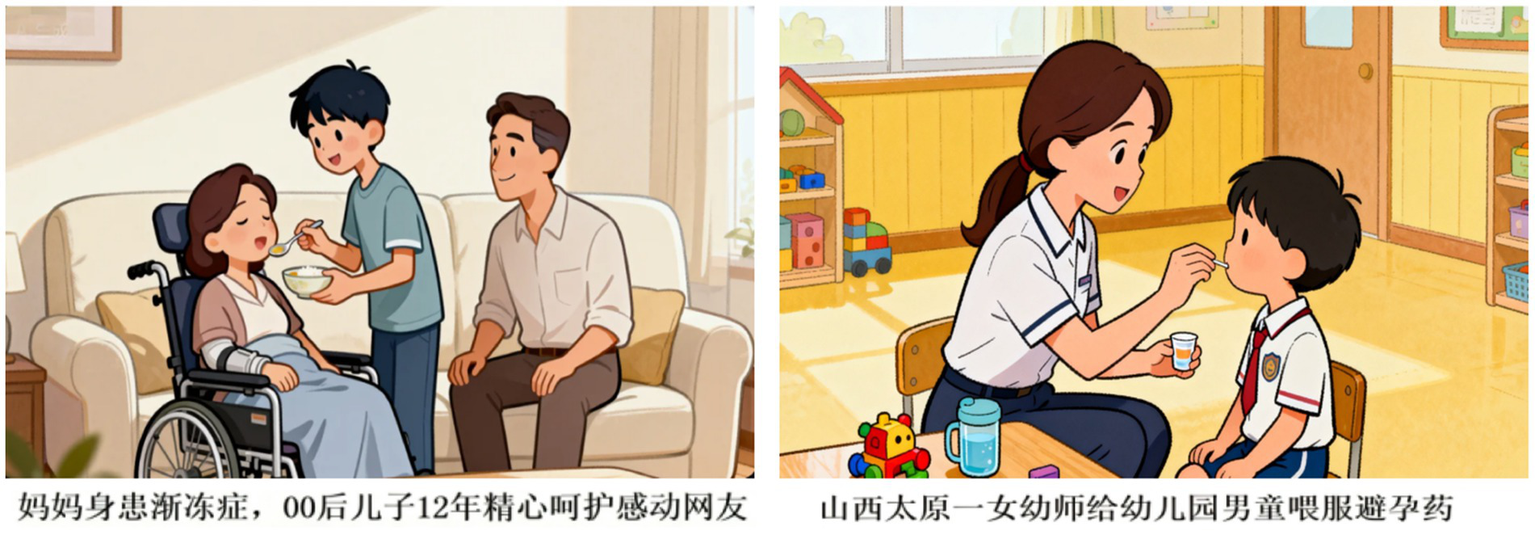 Figure 1. Sample headlines (the left panel presents a real positive news headline: Chinese Gen Z Son’s 12-Year ALS Care for Mother Touches Millions. And the right displays a false negative news headline: Shanxi Kindergarten Teacher Allegedly Force-Feeds Birth Control Pills to Male Pupil).