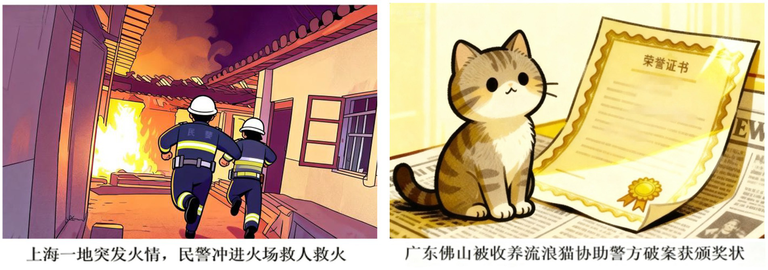 Figure 3. Sample headlines (the left panel presents a real positive news headline: Police Dash into Burning Building to Rescue Residents, Fight Blaze in Shanghai. And the right displays a false positive news headline: “Claw-enforcement”: Adopted Stray Cat in Foshan Helps Crack Case, Gets Award).