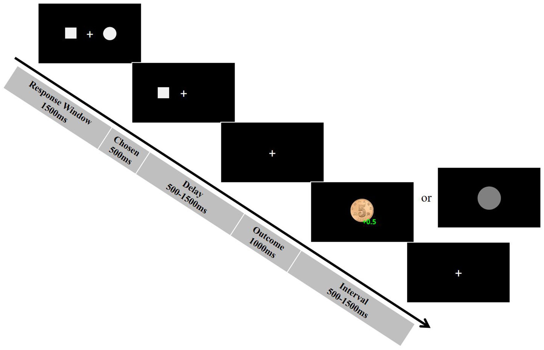 Probabilistic reversal learning task. Participants performed a computerized probabilistic reversal learning task (adapted from Gläscher et al., 2009) designed to measure reinforcement learning mechanisms under uncertainty. In this task, participants repeatedly selected between two visual stimuli—a square and a circle—presented simultaneously on each trial, with the goal of maximizing monetary rewards. They were explicitly informed that accumulated winnings would supplement their base compensation. Each trial followed a structured sequence: Following stimulus onset, participants had 1,500 ms to select one option; failure to respond within this window triggered an automatic random selection by the computer, with reaction time recorded as 1,500 ms. The chosen stimulus was then highlighted for 500 ms. After a variable delay (500–1,500 ms), the outcome (WIN ¥0.5 or LOSS ¥0) was displayed for 1,000 ms. Critically, stimulus-outcome contingencies were probabilistic: One stimulus was designated “correct” (75% probability of WIN; 25% probability of LOSS), while the other was “incorrect” (25% WIN; 75% LOSS). The “LOSS” outcome was coded as ¥0.00 (instead of a negative value) to avoid negative earnings throughout the task. This design was implemented to maintain participant motivation and engagement, and although the outcome is numerically zero, it is psychologically perceived as a loss relative to the winning outcome. A variable inter-trial interval (500–1,500 ms) followed, resulting in a mean trial duration of approximately 5,000 ms (see Figure 1 for schematic). To assess adaptive learning, the contingencies reversed randomly after 5 or 6 consecutive correct choices (this variability prevented anticipation of reversals). Participants needed to learn the new contingencies before another reversal could occur. Across the 60-trial task, up to 10 reversals were possible, with the total number of achieved reversals serving as a behavioral index of adaptive learning capacity. The computational model was fitted to each participant’s trial-by-trial choice data (i.e., which stimulus was selected on each trial), along with the corresponding outcomes (win or loss). Aggregate measures such as accuracy and reversal frequency were used solely as behavioral indices of task performance.