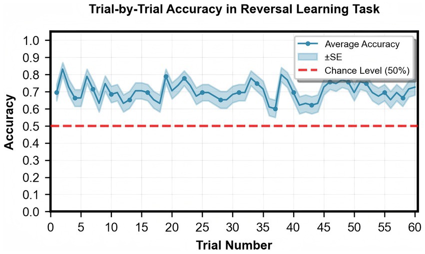 Participants completed 60 trials of the probabilistic reversal learning task, achieving a mean accuracy of 69.4% (SD = 6.7%, Table 1). A one-sample t-test confirmed that the overall accuracy (69.4%) was significantly above chance level (50%), t(94) = 28.22, p < 0.001, Cohen’s d = 2.895, indicating successful learning throughout the task (Figure 2 shows the trial-by-trial accuracy profile). The average number of successful reversals was 3.2 (SD = 1.5). Computational modeling using a hierarchical Bayesian approach estimated individual parameters for reward learning rate (M = 0.72, SD = 0.01), punishment learning rate (M = 0.54, SD = 0.09), and inverse temperature (M = 1.36, SD = 0.62). Model convergence was confirmed by R-hat values < 1.01.