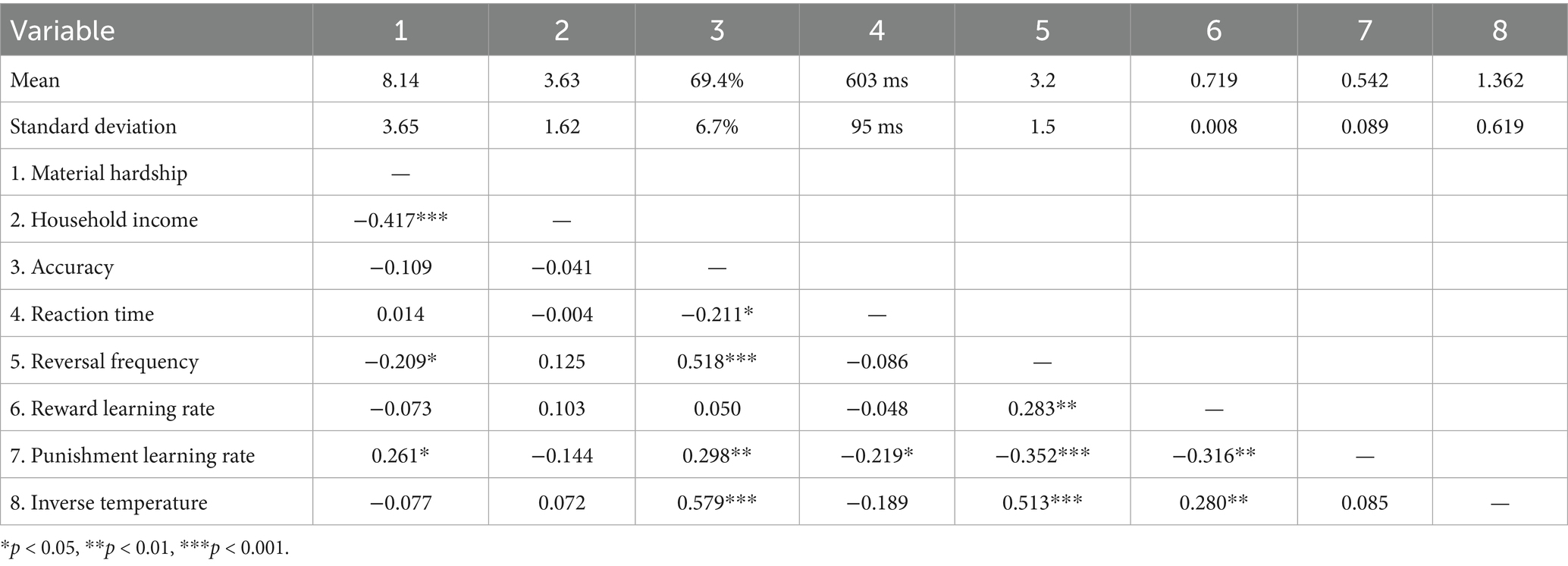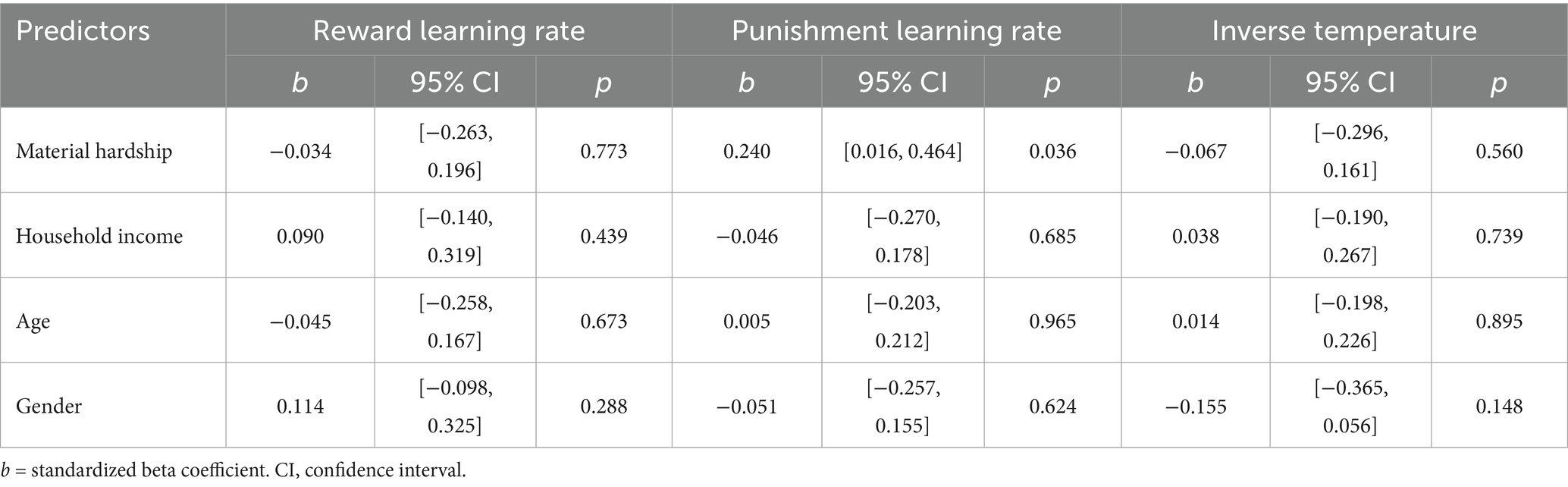 Linear regression models examined how material hardship and household income independently predicted reward learning rate, punishment learning rate, and inverse temperature. Age and gender were included as covariates. Significance was evaluated at p < 0.05, with effect sizes reported as standardized coefficients (b). To ensure robustness, we also applied False Discovery Rate (FDR) correction for multiple comparisons across the three primary dependent variables (Benjamini and Hochberg, 1995). However, in interpreting the results, we focus on the pattern of effect sizes and their confidence intervals, as these provide more meaningful information than dichotomous significance testing alone.