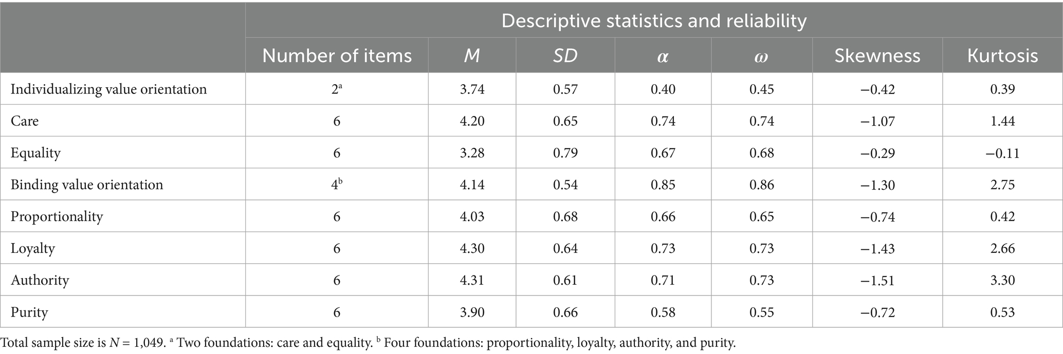 Participants completed the MFQ-2 with the original 36 items in the English language, which is also an official language in Ghana, with six items for every moral foundation. A five-point Likert scale was used, varying from 1 (= does not describe me at all) to 5 (= describes me extremely well), with the following introduction: “For each of the statements below, please indicate how well each statement describes you or your opinions.” (Supplementary Table 1 describes the item text). In Table 1, the first descriptive statistics and the reliability of the MFQ-2 scales are shown. The reliability for the individualizing moral value orientation (α = 0.40; ω = 0.45) and for the purity foundation (α = 0.58; ω = 0.55) is low, but it can be considered high for the binding moral value orientation (α = 0.85; ω = 0.86; Viladrich et al., 2017, see reliability >0.70 as acceptable). The binding moral value orientation (kurtosis = 2.75), the loyalty foundation (kurtosis = 2.66), and the authority foundation (kurtosis = 3.30) revealed problematic kurtosis that indicates difficulties with normal distribution (Hair et al., 2014).