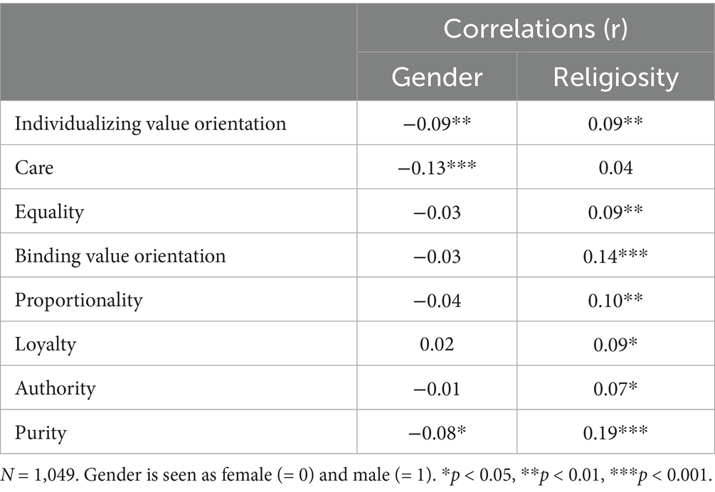 The analyses start by inspecting correlations (r) of MFQ-2 with gender and religiosity (see Table 3). The results show that all correlations for gender are negative, meaning that female students score higher, except for loyalty. The strongest correlations are estimated for gender with the individualizing moral value orientation (r = −0.09), the care foundation (r = −0.13), and the purity foundation (r = −0.08). Correlations between the MFQ-2 and religiosity are all positive. The strongest correlations are found for religiosity within the purity foundation (r = 0.19), the binding moral value orientation (r = 0.14), and the proportionality foundation (r = 0.10).